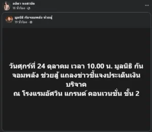 ยังคงเป็นประเด็นที่สังคมให้ความสนใจและวิพากษ์วิจารณ์อย่างต่อเนื่อง เกี่ยวกับมูลนิธิ “กันจอมพลังช่วยสู้” โดยล่าสุด “กัน จอมพลัง” เตรียมเปิดแถลงข่าวชี้แจงรายละเอียดเกี่ยวกับเงินบริจาคของมูลนิธิ เพื่อสร้างความโปร่งใสและความเข้าใจที่ถูกต้อง